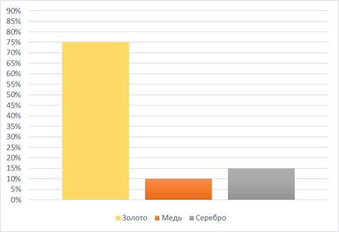 На диаграмме представлен процентный состав золота 750 пробы. Сколько граммов золота, серебра и меди необходимо взять для получения 250 г золота 750 пробы?