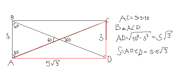 Найдите площадь прямоугольника, если одна из его сторон равна 5 см, а угол между диагоналями равен 60 градусов.