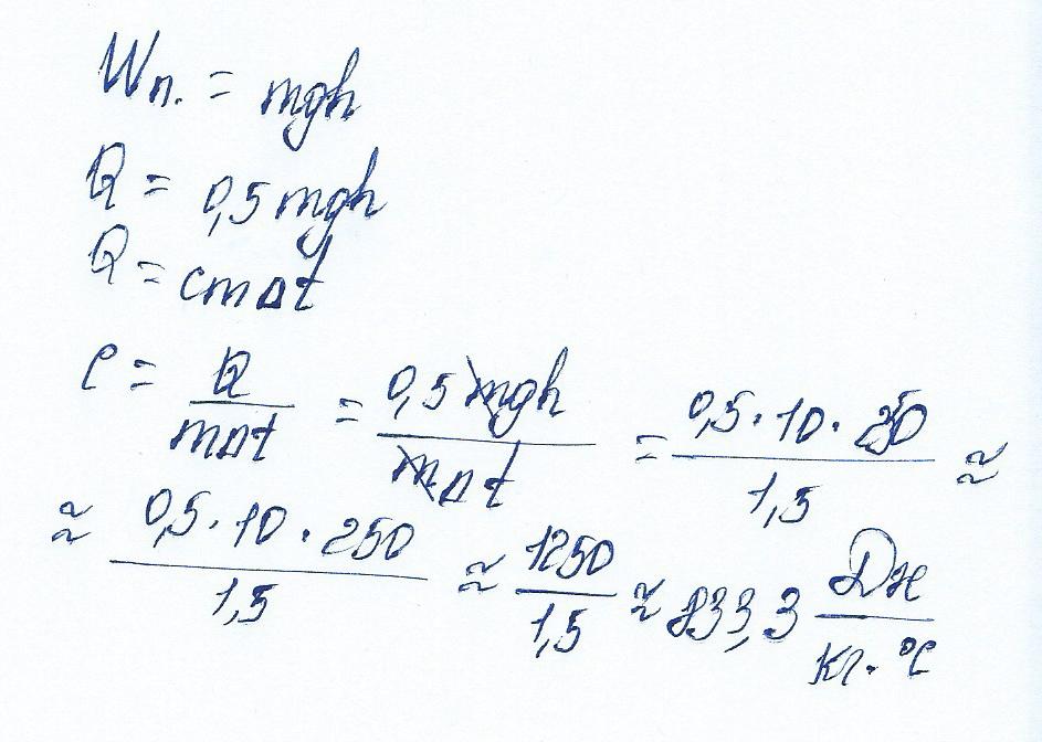в ущелье с высоты 250 м падает камень. Вследствие трения о воздух и удара о землю камень нагревается на 1,5 с . Считая, что 50% начальной механической энергии камня израсходовано на нагревание, определите удельную теплоемкость материала камня.