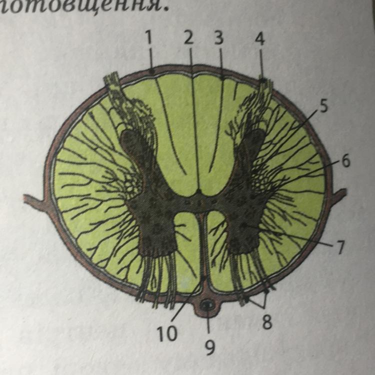 розгляньте поперечний зріз спинного мозку і визначте цифри, якими позначено такі елементи внутрішньої будови: