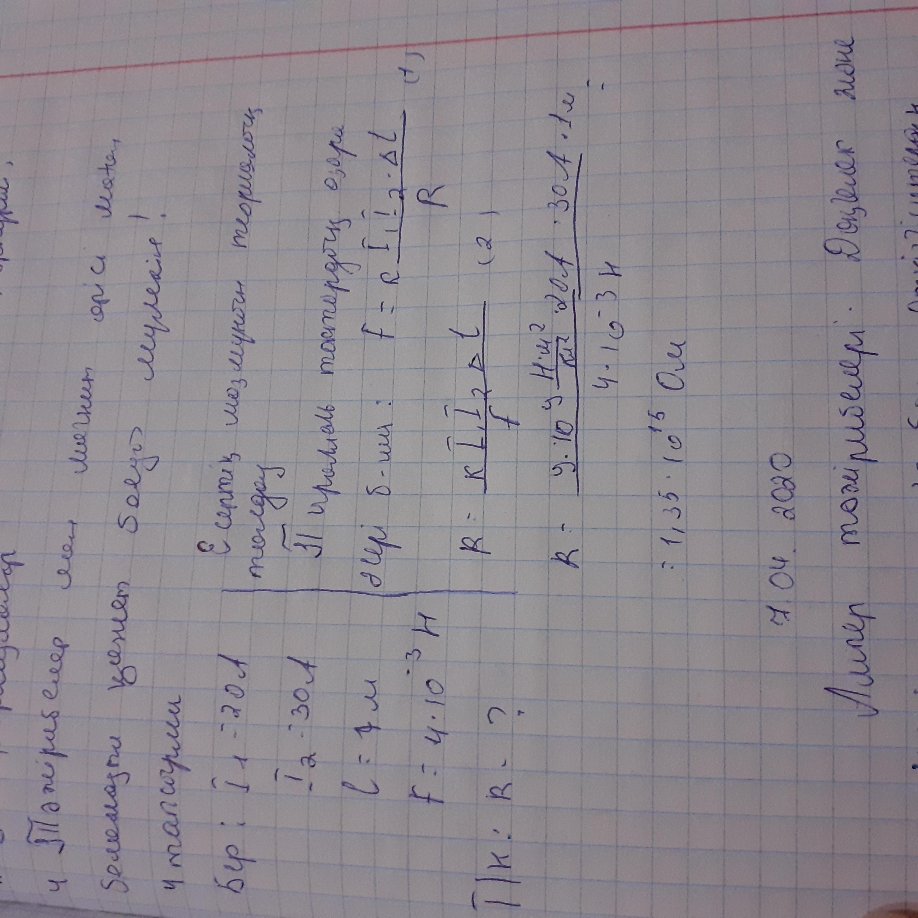 1. Екі параллель өткізгіштердегі ток күштері 20 А және 30 А,әр өткізгіштердің ұзындығы 1 м, егер өткізгіштер 4·10-3 Н күшпен өзара әрекеттессе,онда өткізгіштер арасындағы R арақашықтықты табу керек?