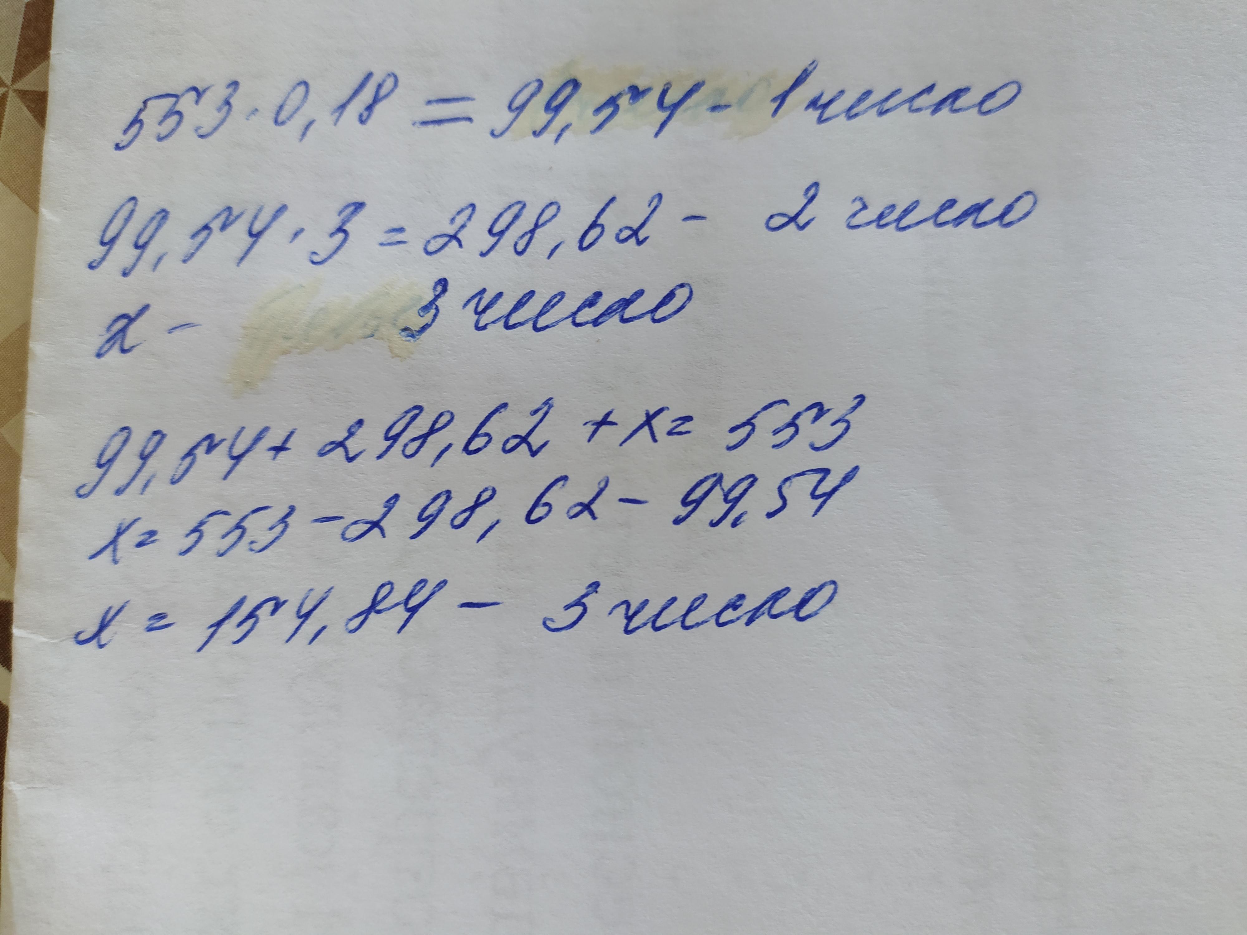 Сумма трёх чисел равна 553. Первое число составляет 18 % этой суммы. Второе число — в 3 раза больше первого. Найди третье число.
