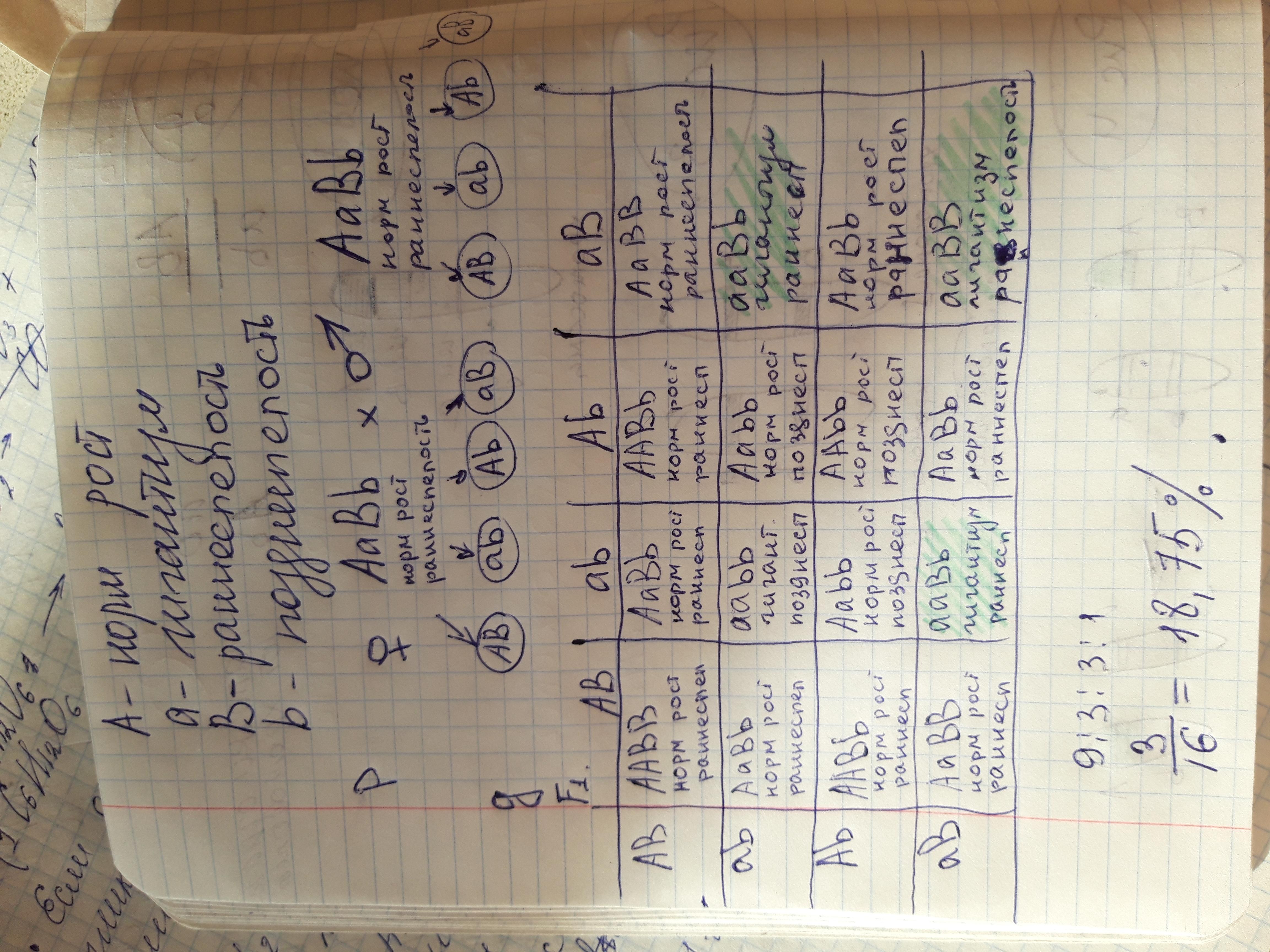 Нормальный рост овса доминирует над гигантизмом, а раннеспелость — над позднеспелостью. Определи вероятность появления в потомстве гигантских раннеспелых растений от скрещивания гетерозиготных по обоим признакам растений