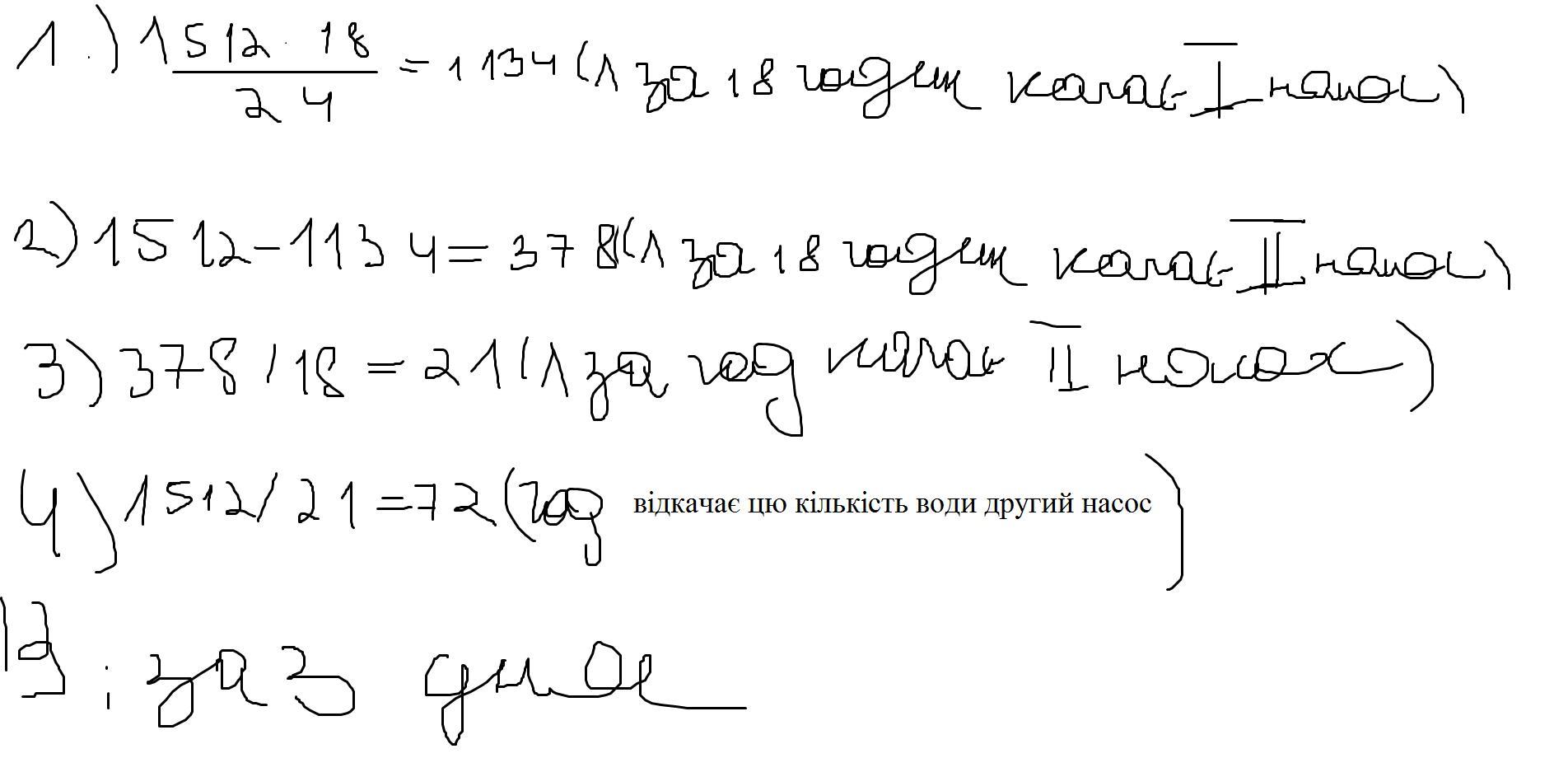 Помогите за ответ 8балов. Задача: один насос працюючи може відкачати 1512л води за 24год а працюючи разом з іншим насосом за 18 год. За який час може відкачати цю кількість води другий насос?