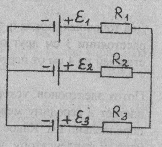 Определить токи в сопротивлениях (см. рис. к задаче), если ε1 = 5 В, ε2 = 3 В, ε3 = 10 В, R1 = 2 Ом, R2 = 1 Ом, R3 = 4 Ом.