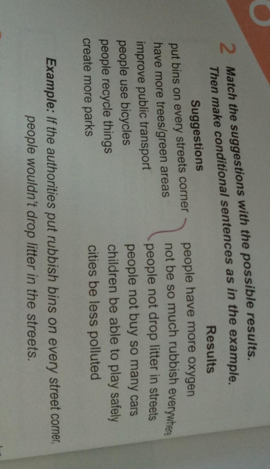 2 Зіставте пропозиції з можливими результатами. Потім складіть умовні речення, як у прикладі. Результати Пропозиції Поставте сміття на кожному розі вулиць, більше дерев / зелені зони покращують громадський транспорт люди користуються велосипедами люди переробляють речі створюють більше парків люди мають більше кисню не так багато сміття скрізь люди не кидають сміття на вулицях люди не купують стільки машин дітей здатні грати безпечно, щоб міста були менш забрудненими. Приклад: Якщо влада поставить сміття на кожному розі вулиці, люди не кинуть сміття на вулиці.