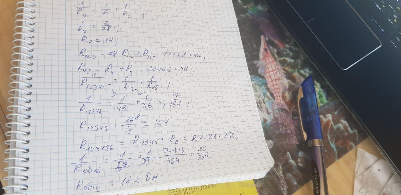 R12345=R123*R45/(R123+R45)=42*56/(42+56)=24 Ом