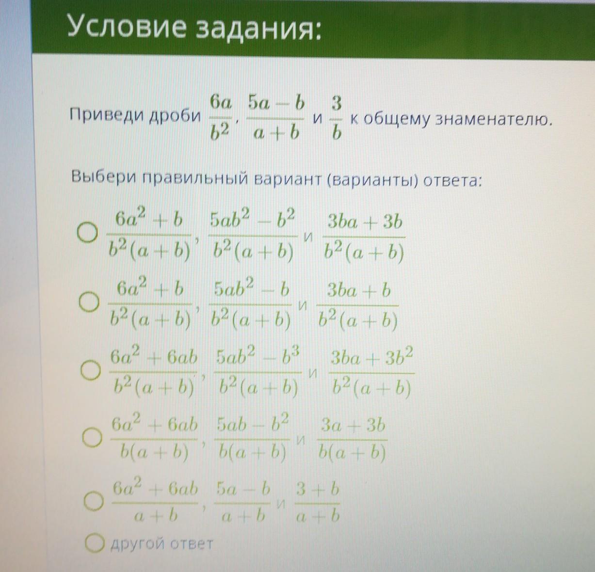 6a^2 +6ab, 5ab^2-b^3, 3ba+3b^2 - числители