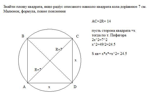 Задача: Знайти площу квадрата, якщо радіус описаного навколо квадрата кола доріавнює 7 см.
