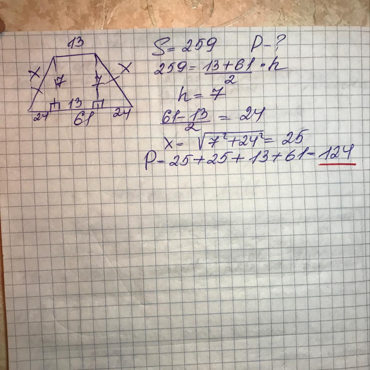 основание равнобедренной трапеции равны 13 и 61 а ее площадь равна 259 найдите периметр трапеции(очень срочно)