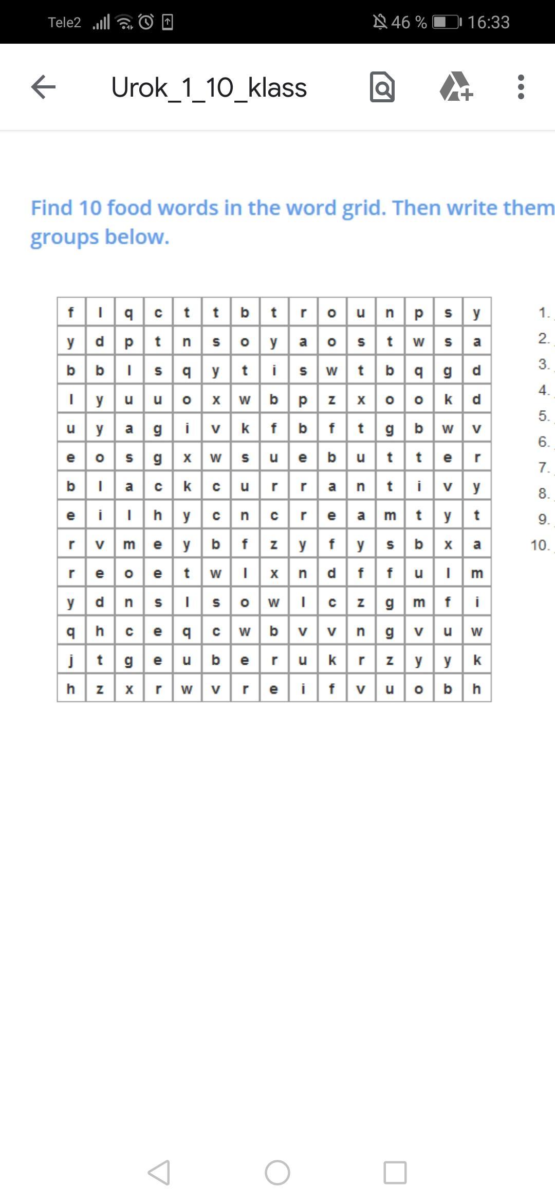 Find 10 food words in the word grid. Then write them groups below. Найдите 10 слов про еду.