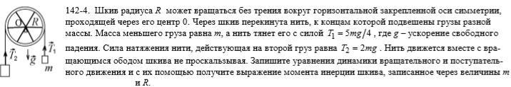 Шкив радиуса R может вращаться без трения вокруг горизонтальной закрепленной оси симметрии, проходящей через его центр 0. Через шкив перекинута нить, к концам которой подвешены грузы разной массы. Масса меньшего груза равна m, а нить тянет его с силой T1 = 5mg/4, где g – ускорение свободного падения. Сила натяжения нити, действующая на второй груз равна T2 = 2mg. Нить движется вместе с вращающимся ободом шкива не проскальзывая. Запишите уравнения динамики вращательного и поступательного движения и с их помощью получите выражение момента инерции шкива, записанное через величины m и R.