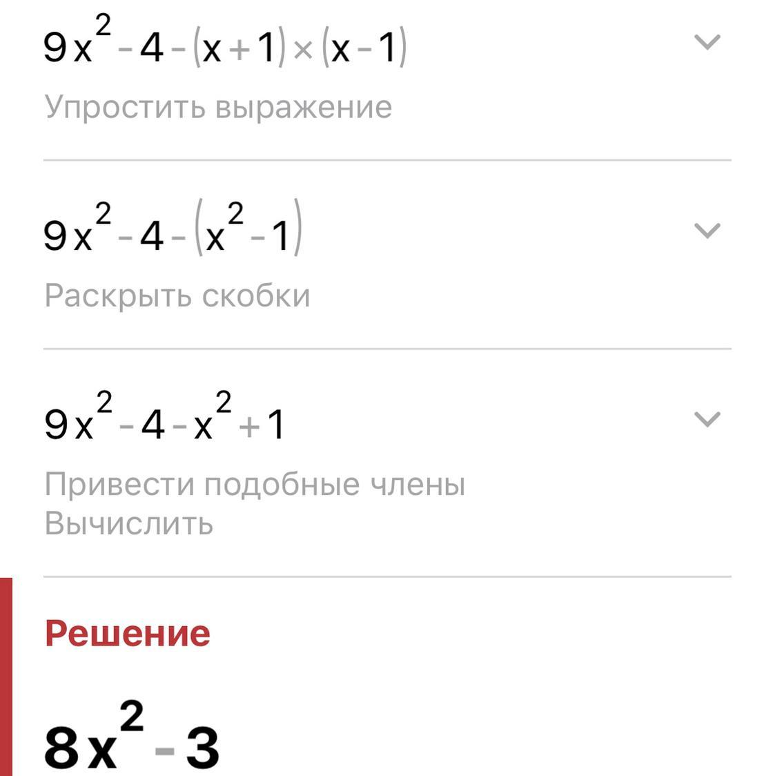 (3х-2)(3х+2)-(1+х)(х-1) = 9х² - 4 -(х+1)(х-1)= 9х² - 4 - (х² - 1) = 9х² - 4 - х² + 1 = 8х² - 3