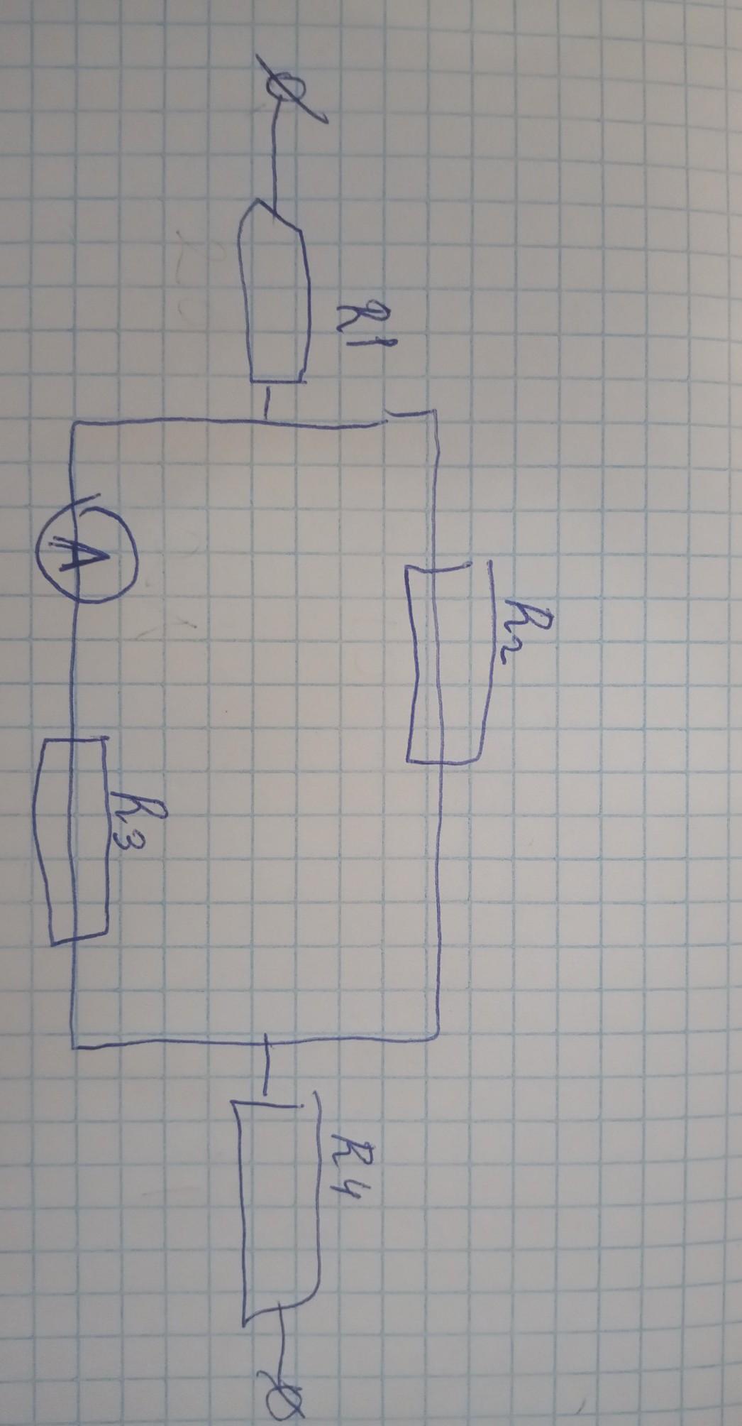 знайти розподіл струмів і напруг між опорами, якщо амперметр показує 2А, R1=20 Oм, R2=10 Ом, R3=15 Ом, R4= 4 Ом