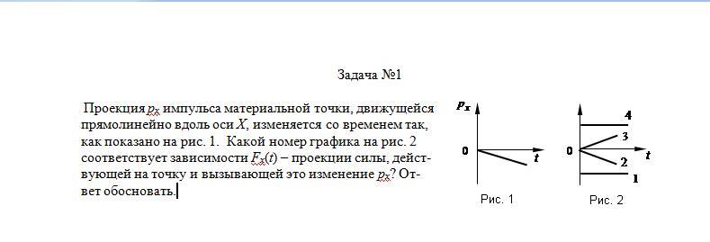 Проекция px импульса материальной точки, движущейся прямолинейно вдоль оси Х, изменяется со временем так, как показано на рис. 1. Какой номер графика на рис. 2 соответствует зависимости Fx(t) – проекции силы, действующей на точку и вызывающей это изменение px? Ответ обосновать.