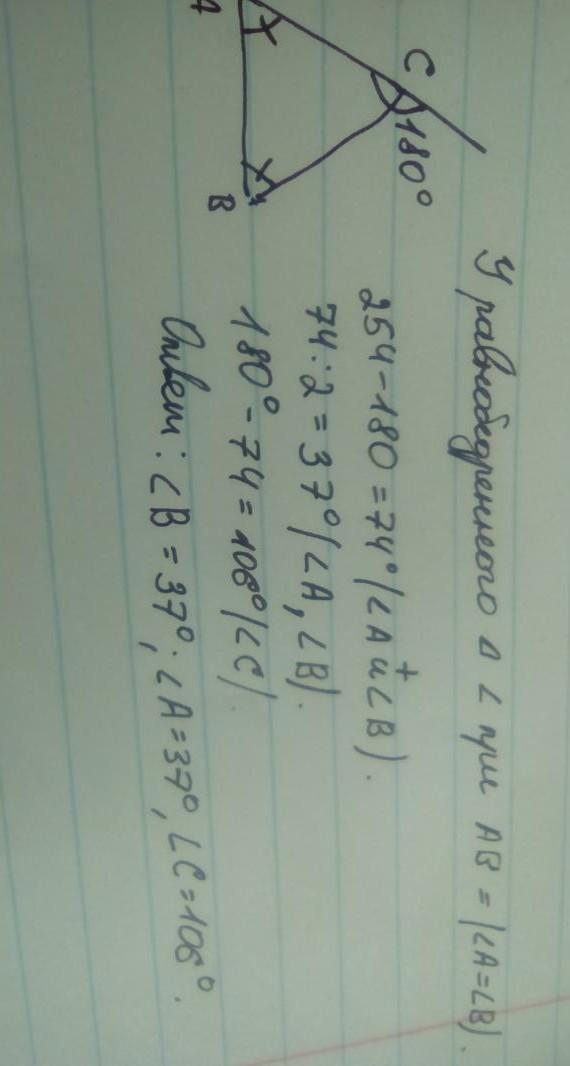 8. Сумма углов равнобедренного треугольника и одного из его внешних углов равна 254 °. Найдите углы треугольника.
