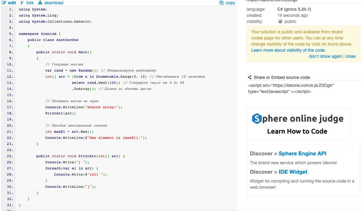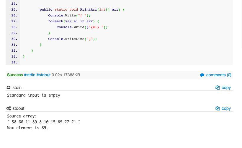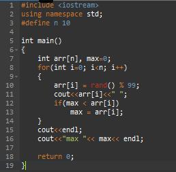 Решить задачу поиска наибольшего элемента массива. Массив заполнить случайными числами из диапазона [0,99].