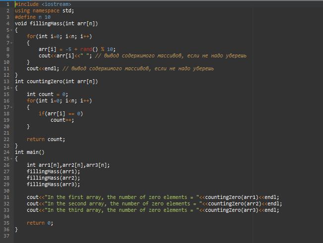 cout<<"In the third array, the number of zero elements = "<<countingZero(arr3)<<endl;