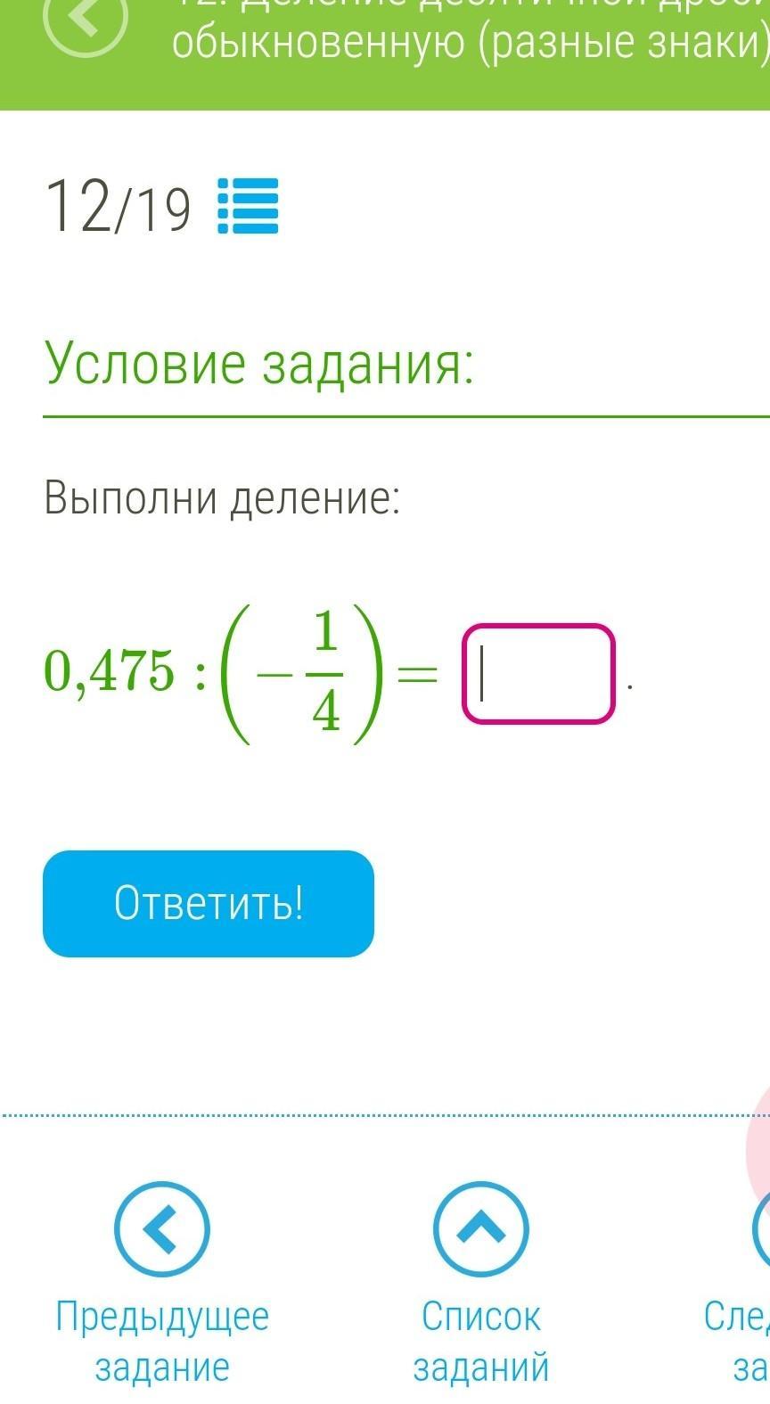 Частное положительного и отрицательного значений отрицательно (+) / (-) = (-)