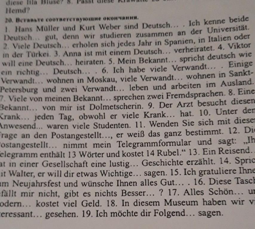 1. Deutsche, Deutschen ; 2. Deutsche ; 3. Deutschen ; 4. Deutsche ; 5. Bekannter, richtiger Deutscher ; 6. Verwandte, Verwandte, Verwandte, Verwandte ; 7. Bekannten ; 8. Bekannte ; 9. Kranken, Kranke; 10. Anwesenden ; 11. Postangestellten ; 12. Postangestellte ; 13. Reisender, lustige ; 14. Wichtiges ; 15. Gute ; 16. Besseres ; 17. Schöne, следующее слово плохо видно , но подразумеваю, что будет окончание -е; 18. Interessantes ; 19. Folgende .