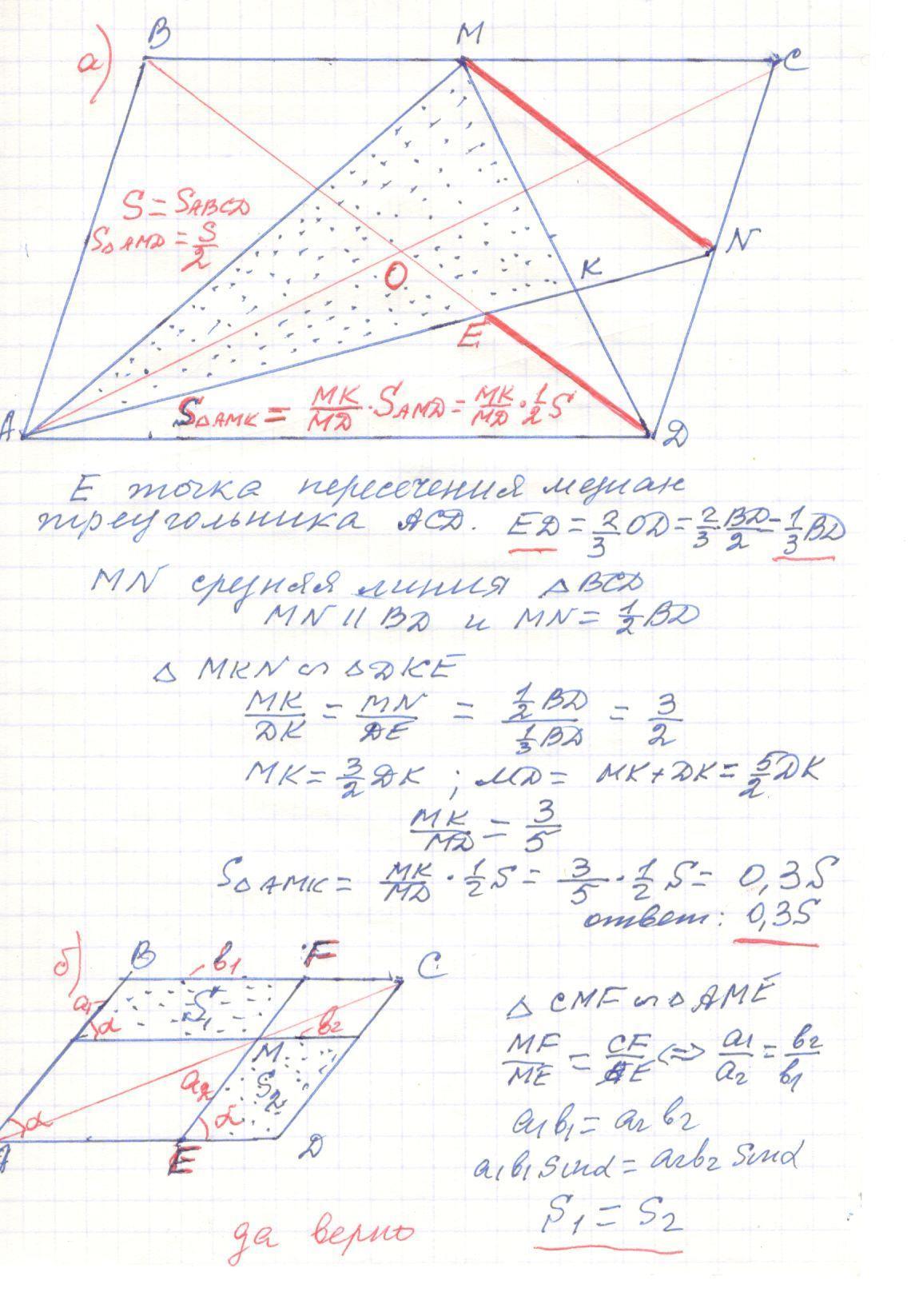 а) S(ΔAMK) = (3/5)S(ΔAMD) =(3/5)*1/2S = 0,3S .