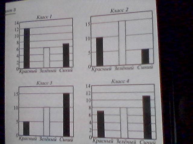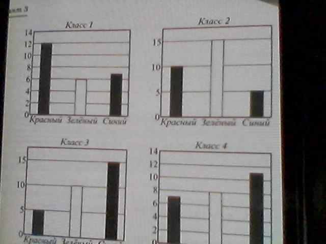 Андрей провел опрос учащихся четырех классов относительно их любимого цвета . После этого он построил столбчатые диограммы . Cколько всего учащихся в этих классах любят синий цвет?