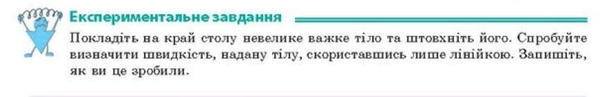 Положите на край стола небольшое тяжелое тело и толкните его. Попробуйте определить скорость, предоставленную телу, воспользовавшись только линейкой. Запишите как вы это сделали.