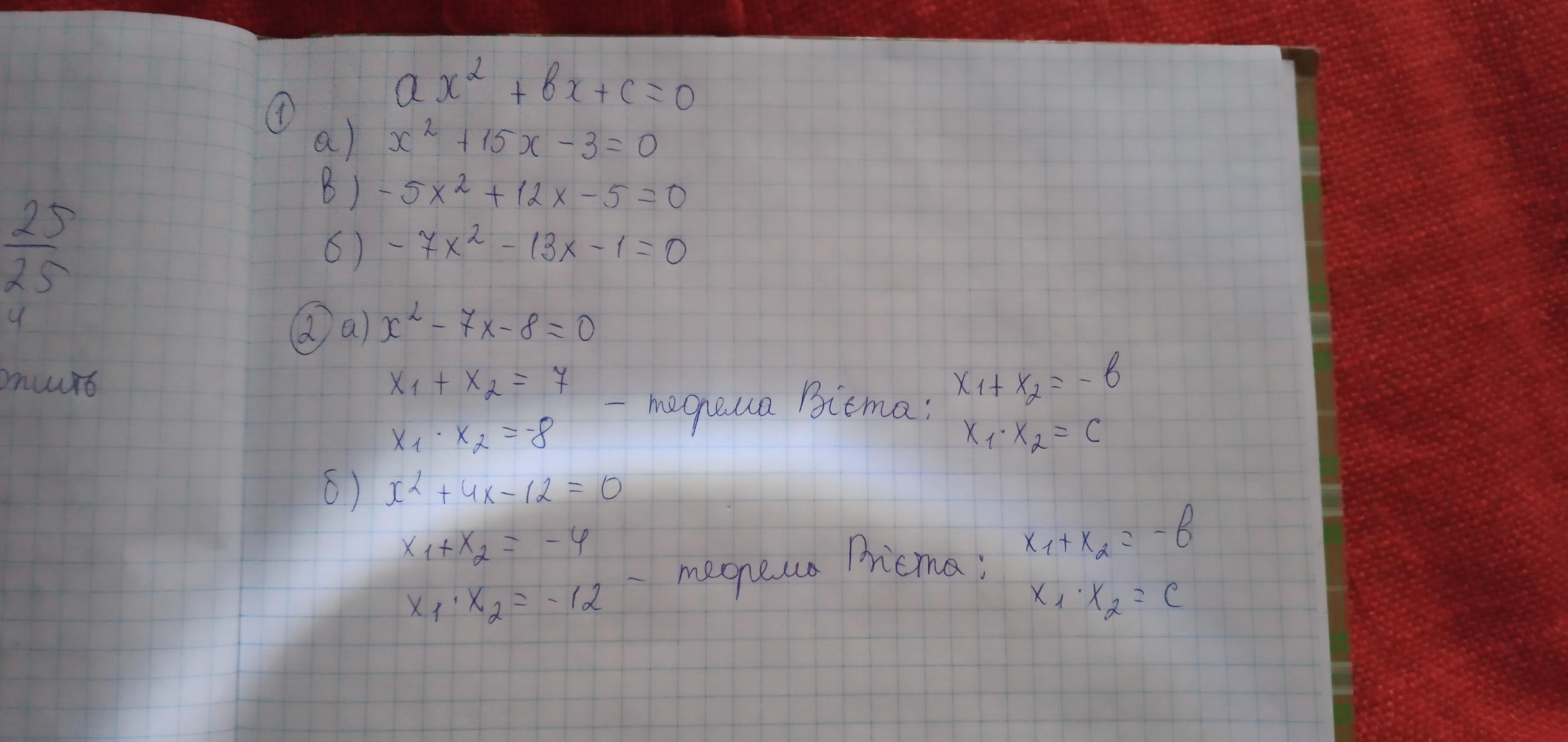 - a) x1=-1 ; x2=8 => 8-1=7 ; 8*(-1)= -8 ;б) x1=-6 ; x2=2 => -6+2=-4 ; -6*2= -12