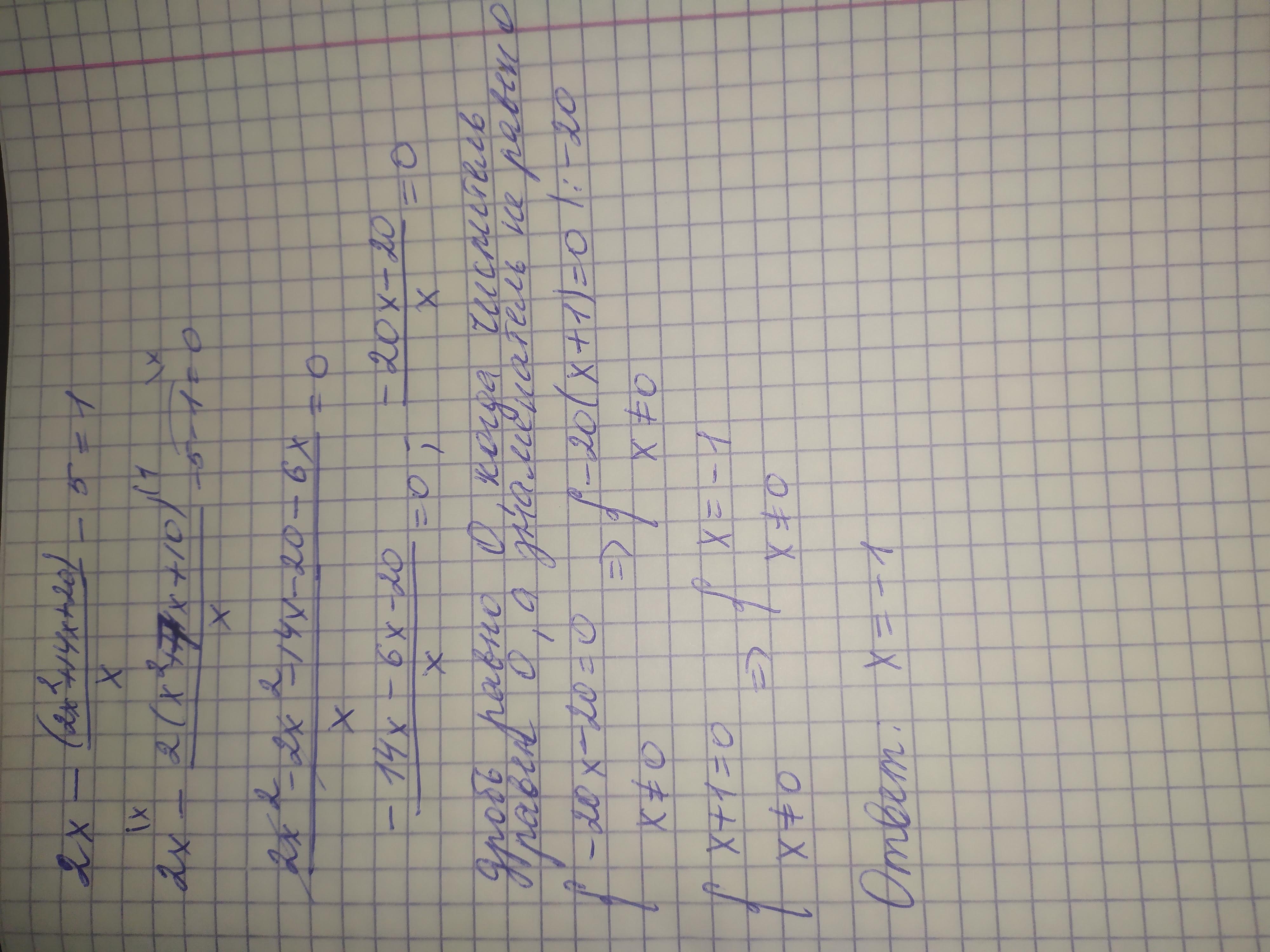 Если в знаменателе не (х-5), а х в исходном уравнении, то решение такое 2x−(2x²+14x+20)/x−5=1