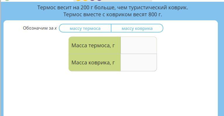 термос весит на 200 г больше, чем туристический коврик. Термос вместе с ковриком весят 800 г