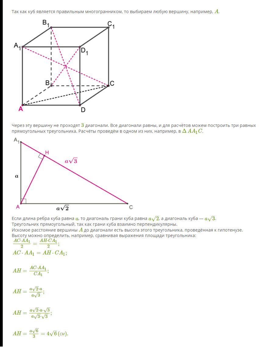 Через эту вершину не проходят 3 диагонали. Все диагонали равны, и для расчётов можем построить три равных прямоугольных треугольника. Расчёты проведём в одном из них, например, в ΔAA1C.