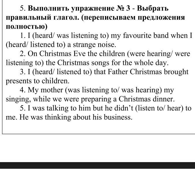 5. I was talking to him but he didn't (listen to/ hear) to me. He was thinking about his business.