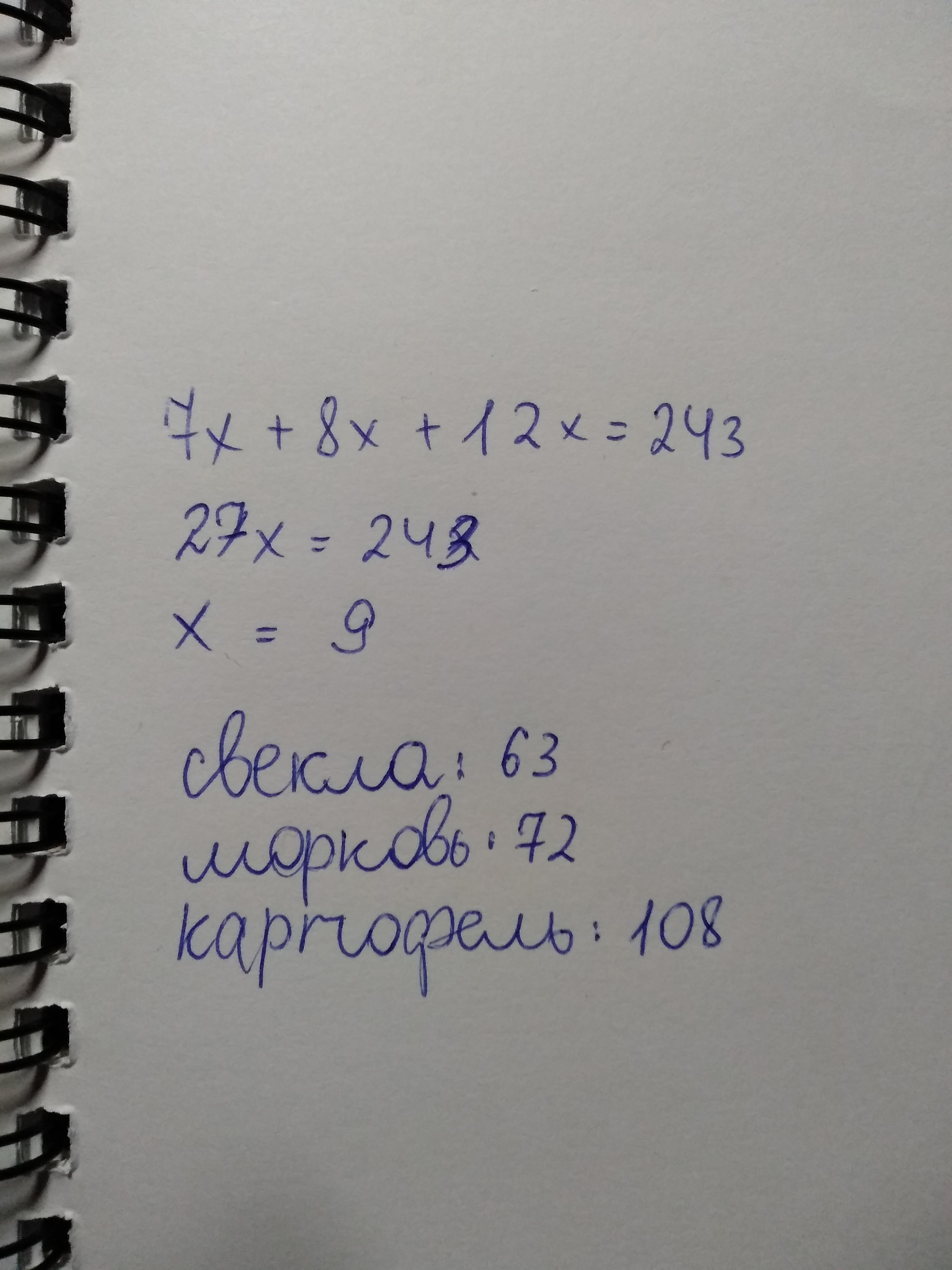 1. В магазин привезли свеклу, морковь и картофель в отношении 7:8:12. Сколько овощей каждого вида привезли в магазин, если масса всех овощей 243 кг?