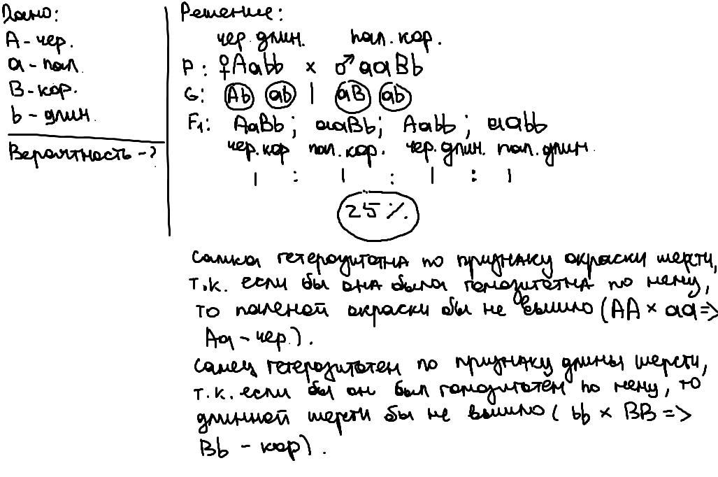 Второе, когда ген, отвечающий за чётный цвет шерсти самки гомозиготный, а ген, отвечающий за короткую шерсть самца гетерозиготный: