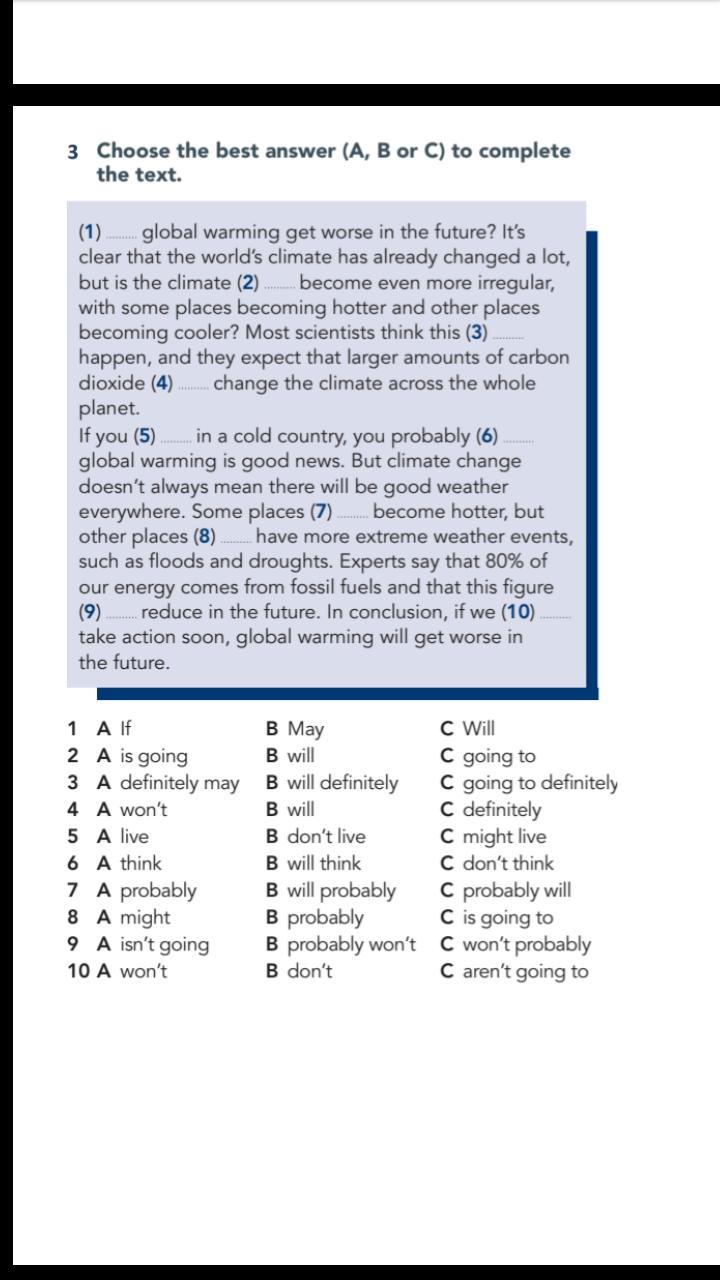 Ответ: 1.Will 2. going to 3. definitely may 4. will 5. live 6. think 7. probably will 8. might 9. probably won't 10. aren't going to