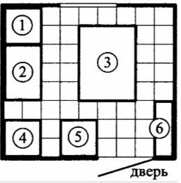 Владелец собирается провести ремонт своей квартиры. На плане (см. выше) изображена будущая расстановка мебели и бытовой техники на кухне после ремонта. Сторона каждой клетки равна 0,4 м. Кухня имеет прямоугольную форму. Единственная дверь кухни деревянная,в стене напротив двери расположено окно. Справа от двери будут поставлены полки для посуды, слева от двери будет холодильник. Слева от холодильника, в углу кухни, предполагается смонтировать раковину. Между раковиной и газовой плитой будет собран буфет, отмеченный на плане цифрой 2. В центре кухни планируется поставить обеденный стол. Пол кухни (в том числе там, где будет стоять мебель и бытовая техника) планируется покрыть плиткой размером 40 см × 40 см. Кроме того, владелец квартиры планирует смонтировать на кухне электрический подогрев пола. Чтобы сэкономить, владелец не станет подводить обогрев под холодильник, газовую плиту, буфет, раковину и полки для посуды, а также на участок площадью 0,32 м2между буфетом и раковиной.