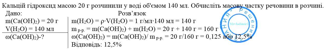 Кальцій гідроксид масою 20 г розчинили у воді об'ємом 140 мл. Обчисліть масову частку речовини в розчині.