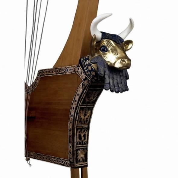 Арфа из царской гробницы в Уре. 26 в. до н. э. Дерево, золото, перламутр, лазурит, песчаник. Обнаружена в 1927-1934 в ходе археологической экспедиция под руководством Чарльза Леонарда Вулли.