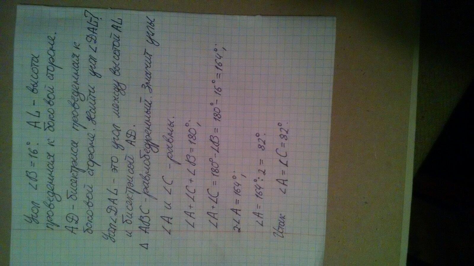 Определи угол между высотой и биссектрисой, если угол вершины ∡ B = 16°.