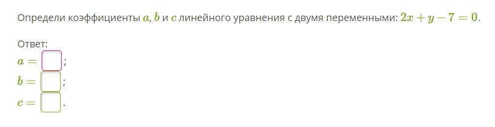 Прошу помочь! Определи коэффициенты a, b и c линейного уравнения с двумя переменными: 2x+y−7=0.