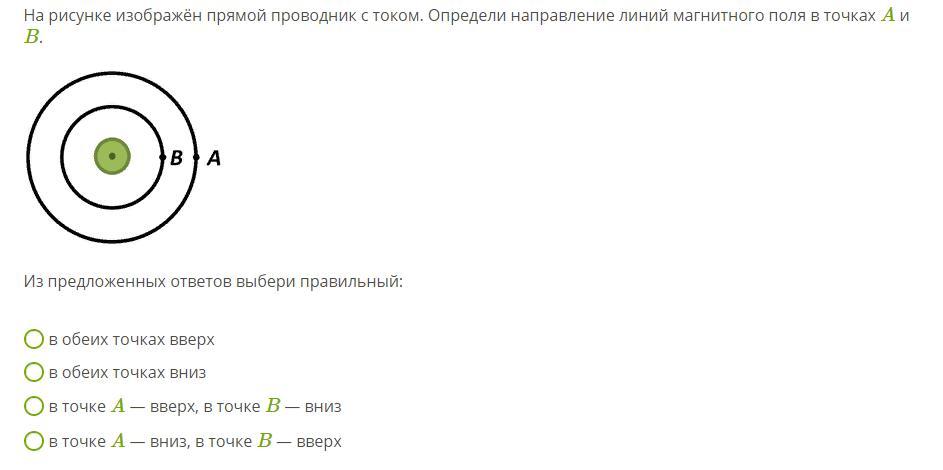Ток течет "к нам", значит палец смотрит "на нас", а значит линии идут против часовой стрелки. Конкретно в точках А и В они направлены в одну сторону, т.е. вверх.