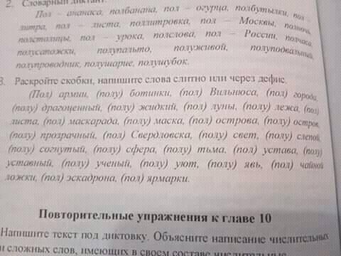 Пол-армии, полуботинки, пол-Вильнюса, полгорода, полудрагоценный, полужидкий, пол-луны, полулежа, пол-листа , полмаскарда, полумаска, пол-острова, полуостров, полупрозрачный, пол-Свердловска, полусвет, полуслепой, полусогнутый, полусфера, полутьма, пол-устава, полууставный, полуученый, полууют, полуявь, полчайной ложки, пол-эскадрона, пол-ярмарки