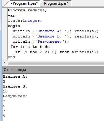2) Вводятся два целых числа A и B. Вывести все нечётные числа от A до B, включая A и B.