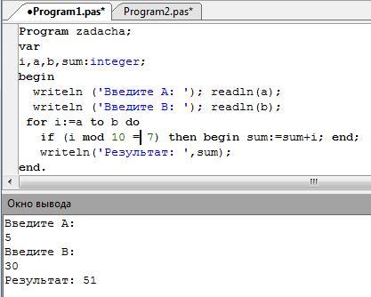 if (i mod 10 = 7) then begin sum:=sum+i; end;