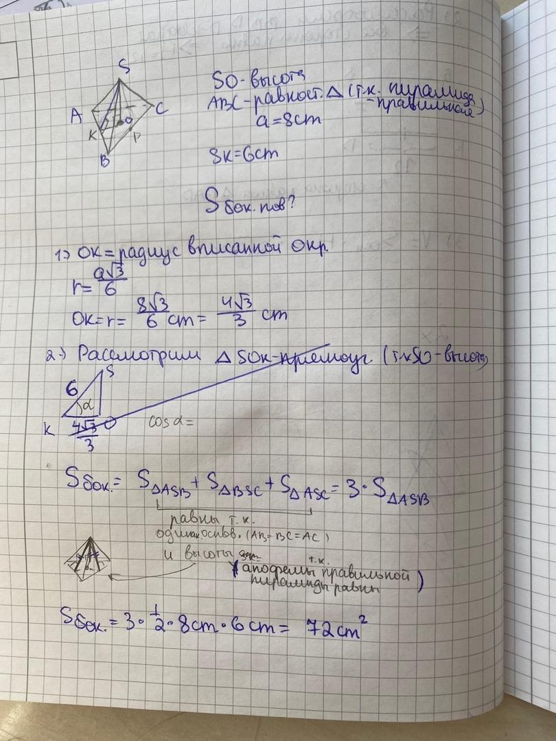 Основанием правильной пирамиды является треугольник со стороной 8 см. Высота боковой грани 6 см. Вычислить площадь боковой поверхности пирамиды. *