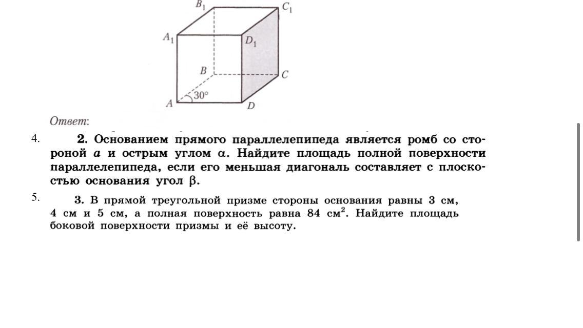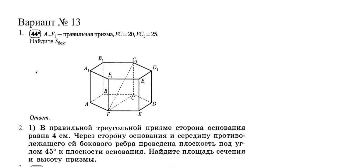 в правильной Треугольной призме сторона основания равна 4 см. через стороны основания и середину противолежащего ей бокового ребро проведена плоскость под углом 45° к плоскости основания. найдите площадь сечения и высоту призмы. помогите решить 1,2,4