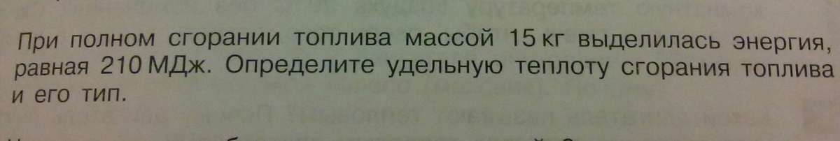 При полном сгорании топлива массой 15 кг выделилась энергия, равная 210 МДж. Определите удельную теплоту сгорания топлива и его тип.