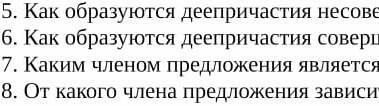 Ответ:5 Деепричастия несовершенного вида образуются от основы настоящего времени глагола при помощи суффикса -а (-я).