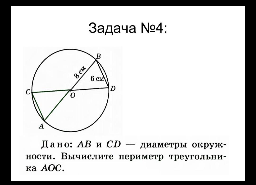 ΔВОD=ΔАОС по 2-м сторонам иуглу между ними :ОВ=ОА=r =8 см, ОD=ОС=r=8 см, ∠СОА=∠DОВ как вертикальные.