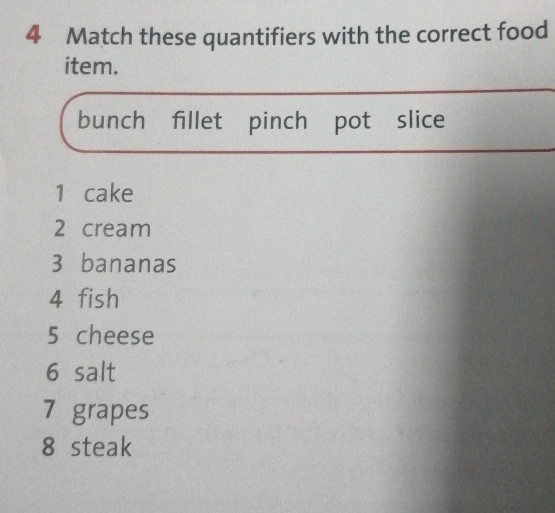 1. a slice of cakes. 2.a pot of creams. 3.a bunch of bananas. 4.a fillet of fish. 5.a slike of cheese. 6.a pinch of salt. 7.a bunch of grapes. 8.a fillet of steak.